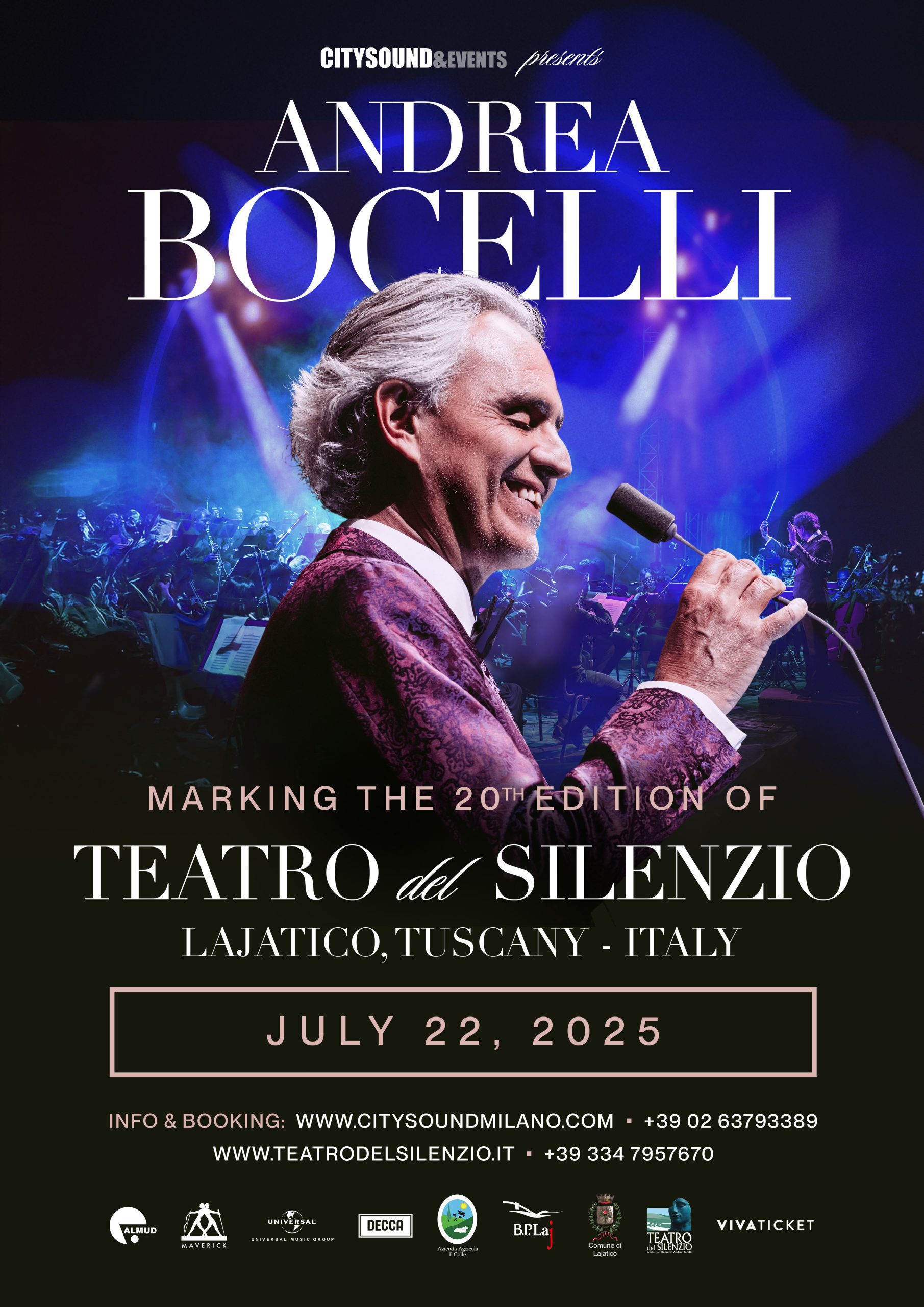 Vi hälsar dig välkommen till en storslagen musikupplevelse – Andrea Bocellis konsert i hans hemstad Lajatico i Toscana. Den 25 juli går maestro Bocelli upp på scen för en unik kväll som firar 30-årsjubileet av Romanza, albumet från 1996 som innehåller några av de mest älskade sångerna i modern musikhistoria – melodier som blivit en del av ljudspåret i miljoner människors liv världen över.